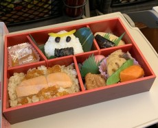 Traveling with the band members made us feel as if3 it was a school graduation trip. Everybody had lunch on the train. I had a box lunch with Musubi Maru with harako meshi (salmon rice with salmon roe4 on top), colorful veggies5 and stuff6 and even a dessert to enjoy at the end. This lunch made my trip even more fun!